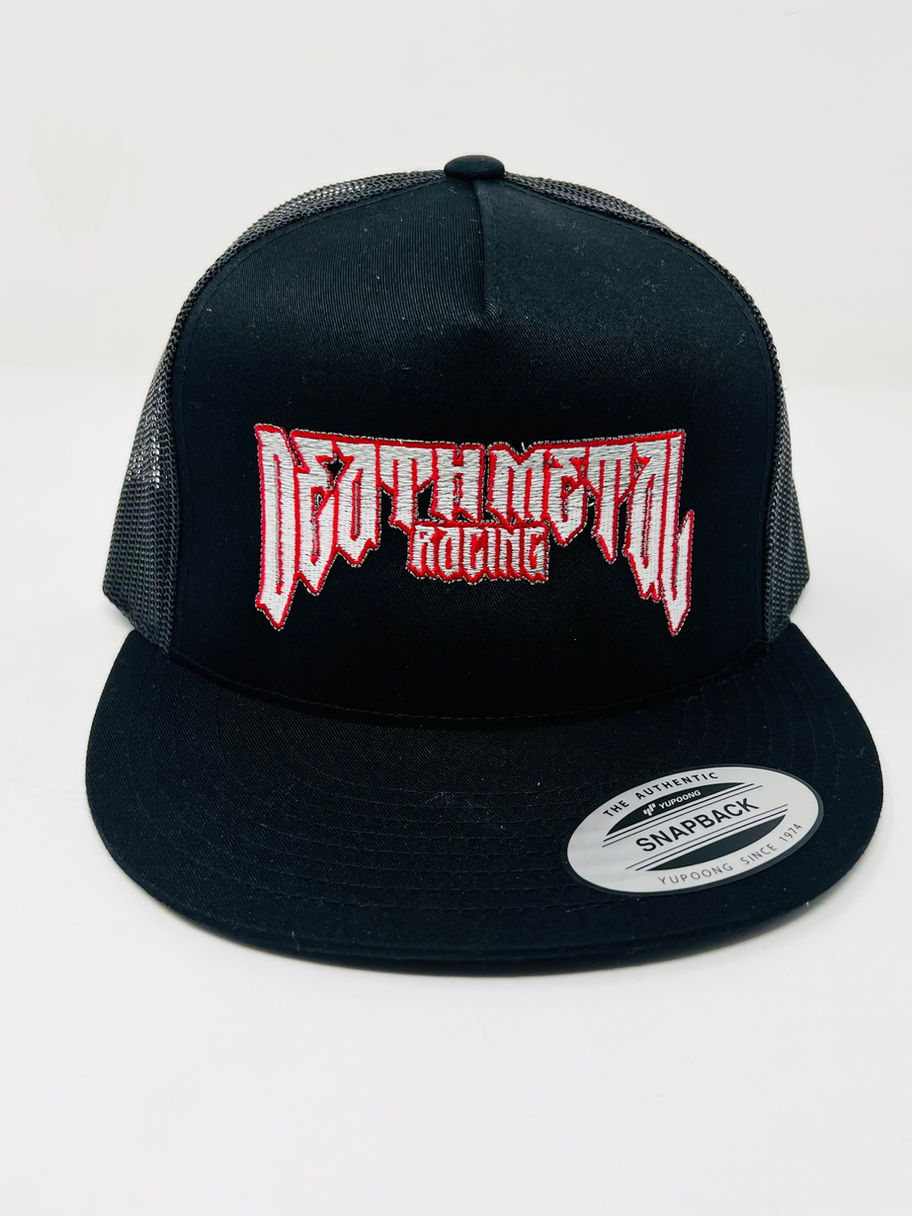 THE CLASSIC YUPOONG 6006 STRUCTURED STYLE TRUCKER SNAPBACK with silver and red outlined Death Metal Racing embroidered on the front. Black front with black rear mesh.