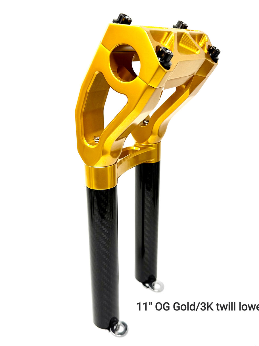 DMR Diamondback Modular Pullback Risers with carbon fiber legs. Your choice of 3K Twill or Forged carbon fiber lower legs. Pics of risers with regular anodized legs for color reference only. Available in 7", 9", 11", and 13"(measured from the bottom of the riser legs to the center of the clamping area). Or take the cross bar off and reduce the height by almost an inch (customer will need shorter 1/2-13 studs to reassemble risers without crossbar, shorter bolts not included). 1-1/2" of pullback. Very detailed and unique design. Everything is interchangeable for a true modular design. Fits 1-1/8" bars and 1" bars with our Diamondback riser reducers (sold separately). Beautifully CNC machined from 6061 T-6 aircraft grade billet aluminum. Two 1/4-20 tapped holes hidden under the riser body on each side for use with our Diamondback gauge bracket (sold separately). Comes with titanium top clamp bolts in black, silver, and blue. Bolts are specialty pvd coated and will not rust like ARP bolts. Risers available in raw/machine finish, polished finish, chrome, numerous anodized, and powdercoated colors. Powdercoat orders are sent to powdecoat as the order comes in and typically takes 1 to 1-1/2 week turnaround time. We also offer the Diamondback riser body & clamp, round riser legs, and cross brace separately on the site for those that want to really build and create their own unique, customized riser design. Includes top clamp, riser body, cross brace, 1-1/4" diameter round riser legs, 12 point top clamp bolts, riser body bolts that go through the cross brace and into the riser legs. Due to differences in riser bushing sizes, triple tree thicknesses, and bolt lengths from model to model, we do not include the bottom riser bushings and bottom riser bolts. We recommend solid riser bushing for those wanting a good solid/no flex feel, especially the taller you go with the riser height. You can run good poly bushing but they can flex when turning the bar especially with the taller heights. The risers have 1/2"-13 threads. Measure accordingly to get the correct riser bolt length. We recommend that the bottom riser bolts go into the riser legs at least 3/4" to 1" for good safe solid thread engagement. To get the correct length, measure the thickness of the riser bushings installed into your triple trees with the washers. For example, if the bushings with the washers measure 1-1/2" thick and you want 3/4" thread engagement, add 1-1/2" to 3/4" which equals 2-1/4". You would need a 2-1/4" riser bolt (bolt measurements are taken from under the head of the bolt to the end of the threads). If you have triple trees that don't use bushings, measure the thickness of the trees. For example, if the trees are 1-1/4" thick and you want 3/4" thread engagement, then you would add the two together and you would need 2" long riser bolts. These are just examples, you must measure for your particular application. There is no one size fits all. Triple trees vary in thickness from brand to brand and bike to bike, YOU MUST MEASURE! As always, free shipping inside the continental USA, outside that pays actual shipping costs. Proudly made in USA!