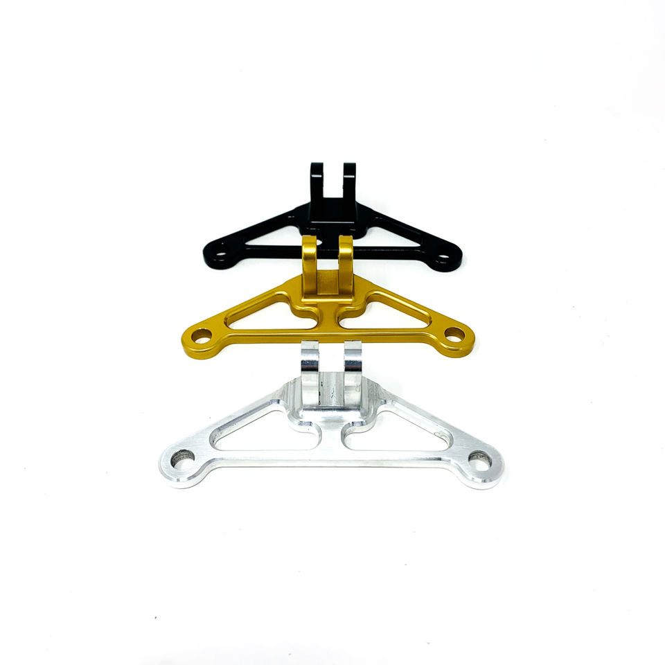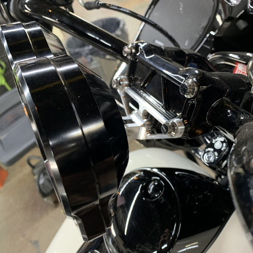 BILLET ALUMINUM GAUGE MOUNT. WORKS GREAT WITH OUR DESTROYER RISERS OR ANY RISER THAT HAS A 4-1/4" (4.250") ON CENTER BOLT PATTERN (WILL NOT WORK WITH DMR DIAMONDBACK RISERS). THIS IS A VERY COMMON BOLT HOLE SPREAD ON MANY FACTORY HD STAGGERED BOLT PATTERN RISERS. DISTANCE BETWEEN MOUNTING TAB IS 3/8" WHICH IS A PRETTY STANDARD WIDTH IN THE INDUSTRY. COMES WITH A COUNTER SUNK 5/16-18 BOLT. THESE CAN BE USED IN A MANY DIFFERENT APPLICATIONS. WORKS GREAT WITH ANY OF OUR GAUGE HOUSINGS, EXTENSION ARMS, SWIVELS, AND GAUGE HOUSINGS SUCH AS KRAUS WITH A 3/8" TAB. MAKE YOUR OWN ATTACHMENT AND MOUNT A MOTO GADGET GAUGE, TACH, PHONE, ETC. Available in a variety of anodized colors, chrome, powdercoat, and machine finish. Machine finish may have small imperfections from the machining process and have not been smoothed or polished, only deburred. It is meant to be coated and finished by the customer but can be scotchbrited or run as is. Due to the thickness of powdercoat, powdercoated parts normally require some or all of the powdercoat to be removed where the mating parts attach such as gauge clamps, gauge brackets, extension arms, or gauge housings. This sometimes includes removing powdercoat from bolt holes also. Harley Bronze powdercoat is now available. THIS COLOR IS NOT CONSISTENT AND IS NOT GUARANTEED TO BE THE SAME TONE THROUGHOUT THE PART. THIS IS THE SAME WAY IT IS WITH THE HARLEY BRONZE FROM THE FACTORY. NO RETURNS ON BRONZE POWDERCOATED PARTS DUE TO COLOR INCONSISTENCIES. Powdercoat parts are done per order and usually take 1 to 1-1/2 weeks turnaround. (NOTE POWDERCOATING IS SEVERAL MILS THICK AND YOU MAY HAVE TO REMOVE POWDERCOAT OFF OF MOUNTING SURFACE BETWEEN TABS FOR GAUGE TO FIT). Available with or without longer bolts for our risers. Any time a gauge bracket is added to the top of risers, a bolt 1/4" longer is needed. If you select longer bolts for our risers, 12pt stainless or 12pt black plated chromoly bolts are available for the top clamp. **The black plated chromoly bolts can possibly rust if exposed to the elements**. When selecting the bolt option, you must choose which clamp option you have. We offer them for the standard destroyer clamp (with the triangle cut outs on top) or the HUD clamp (gauge cut out on top of clamp) which is standard for the new lowrider ST and newer street bobs with the integrated gauge in the risers. BOTH ARE SHOWN IN PICS ABOVE. If you are ordering this for any other brand of riser, you must figure out the bolt length needed and source that yourself. MADE IN THE USA