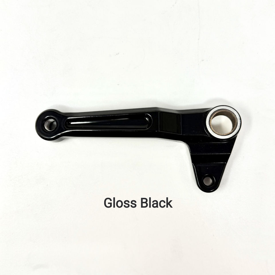 DMR billet shift lever for Harley Pan America models. The DMR shift lever is made from 6061-T6 billet aluminum. Not only does it look much better than the stock lever or any other lever on the market, it works better! The shift lever itself is the same length as the stock shifter, but with the addition of our adjustable 5/8" or 1" extension, you can now adjust the shifter peg up or down in 10 degree increments which equates to 2-1/4" adjustment range with the 1" extension and 1-5/8" adjustment range with the 5/8" extension. It can be adjusted without taking the shift lever off. Extension includes the mounting bolt. The back side of the shifter is splined where the extension attaches and the shifter extension is splined also for a solid, no slip fit. Will work with both stock shift linkage and quick shift linkage. Our arm is offset to allow for more clearance of the kickstand. A big problem with the stock shifter is your foot can hit the kickstand tab when shifting and if you have a stock shifter with a quick shifter, you cannot adjust the shift lever up or down. Our shifter arm with extension resolves this issue. Our arm also comes with an oilite bronze bushing that has a much smoother feel than stock, much more durable, and more solid shifts than with the stock plastic bushing. The stock pan america shifter peg WILL NOT work on our shifter. Our shift lever and extensions have a 5/16-24 threaded hole for the shifter peg. All other Harley and aftermarket shifter pegs with that thead pitch will work. This opens up alot more shifter peg options with the 5/16-24 hole. These are available in machine finish and powdercoat finishes. Powdercoat finishes will take a week to week and a half turn around time. We try to keep a couple of powdercoated levers on the shelf but to keep cost and inventory down, we normally send these out to be coated as the order comes in. Powdercoater picks up and drops off once a week. Proudly made in USA!