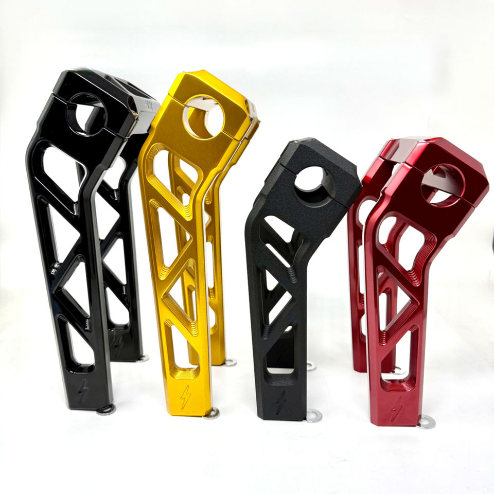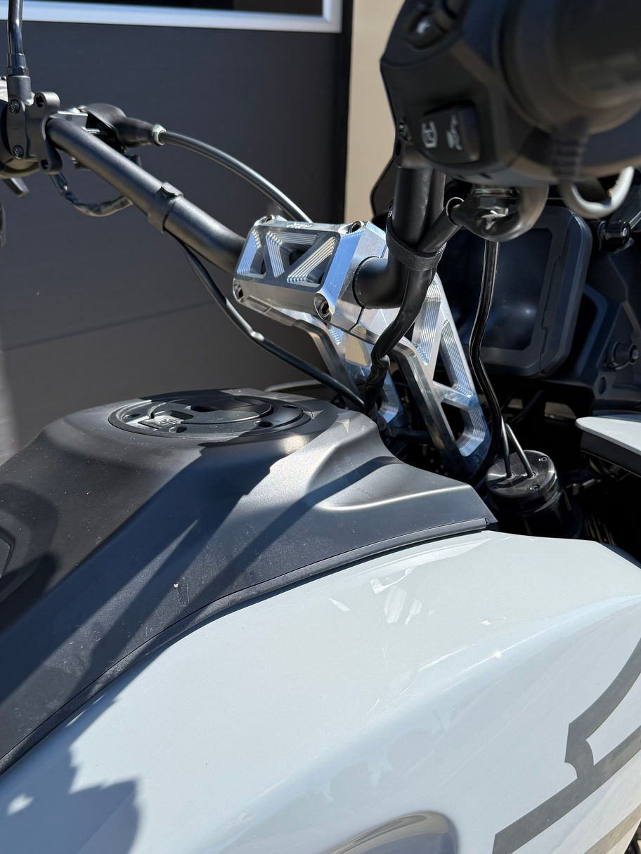 DEATH METAL RACING PAN AMERICA DESTROYER PULLBACK RISERS. Same great quality as our original DESTOYER pullback risers but made for all Pan America models. Made from 6061 T-6 aircraft grade aluminum. Fits factory 1-1/4" bars and 1-1/8" bars with our Pan America destoryer riser reducers sold separately. Risers have 1-1/2" of pullback. They come with stainless allenhead 5/16-18 bolts for the top clamp. Re-uses the factory bottom riser bolts. Available in 8" and 10" heights. These are available in a variety of anodized colors, powdercoat, and machine finish. Machine finish may have small imperfections from the machining process and have not been smoothed or polished, only deburred. It is meant to be coated and finished by the customer but can be scotchbrited or run as is. Powdercoat parts are done per order and usually take 1 to 1-1/2 weeks turnaround. PROUDLY MADE IN USA!!!