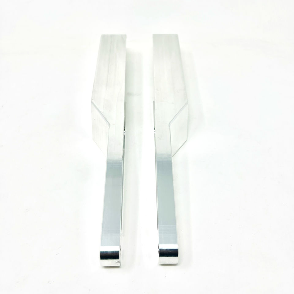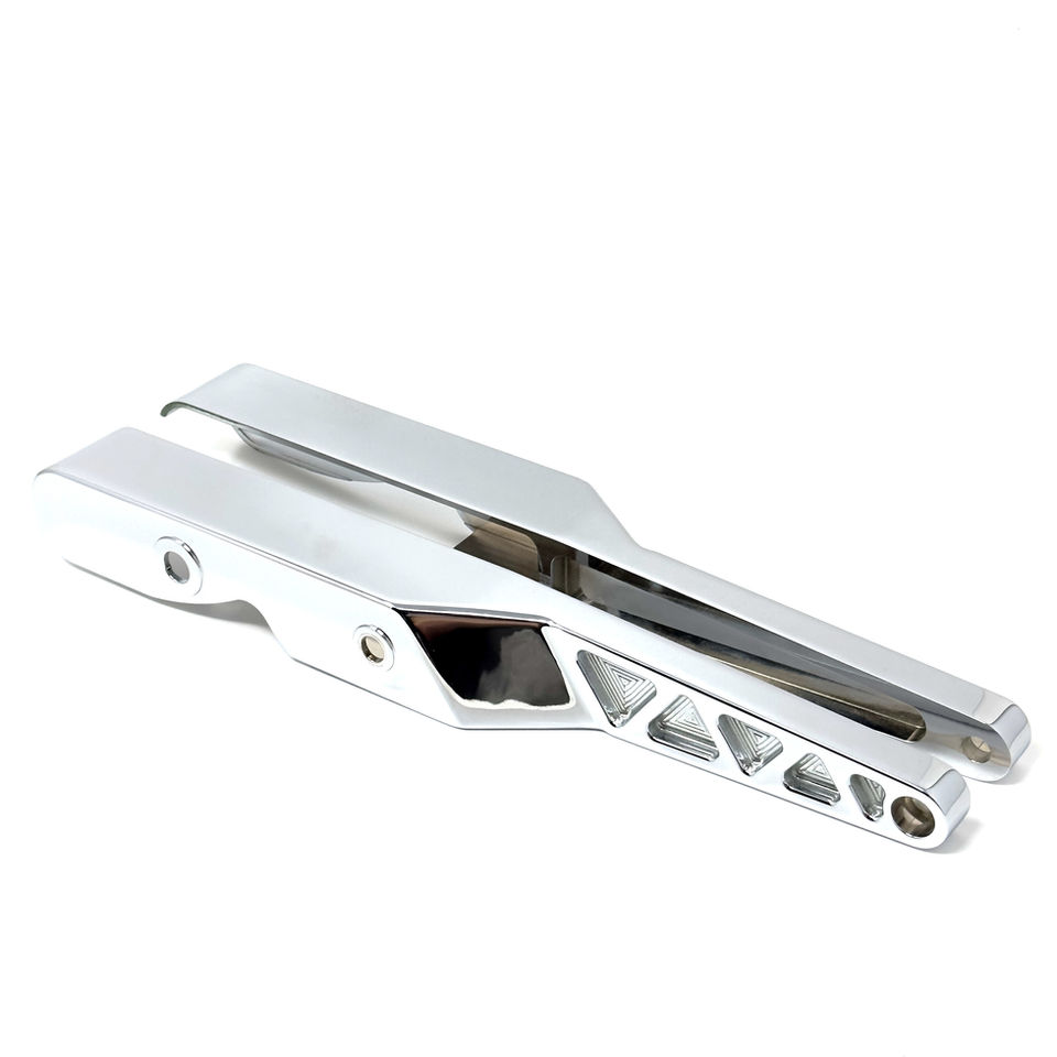 New design slimmer Destroyer FXR fender struts. Now thinner in the rear section and tapers more as they go back. MACHINED FROM 6061 T-6 BILLET. AVAILABLE IN RAW/MACHINE FINISH, CHROME, OR GLOSS BLACK POWDERCOAT. Powdercoat orders are coated per order and is usually a 1 to 1-1/2 week turn around time. Raw/machine finish will have machine lines and some marks from machining process. FITS 87-UP FXR (EXCEPT FXRT & FXRP) PROUDLY MADE IN THE U.S.A.