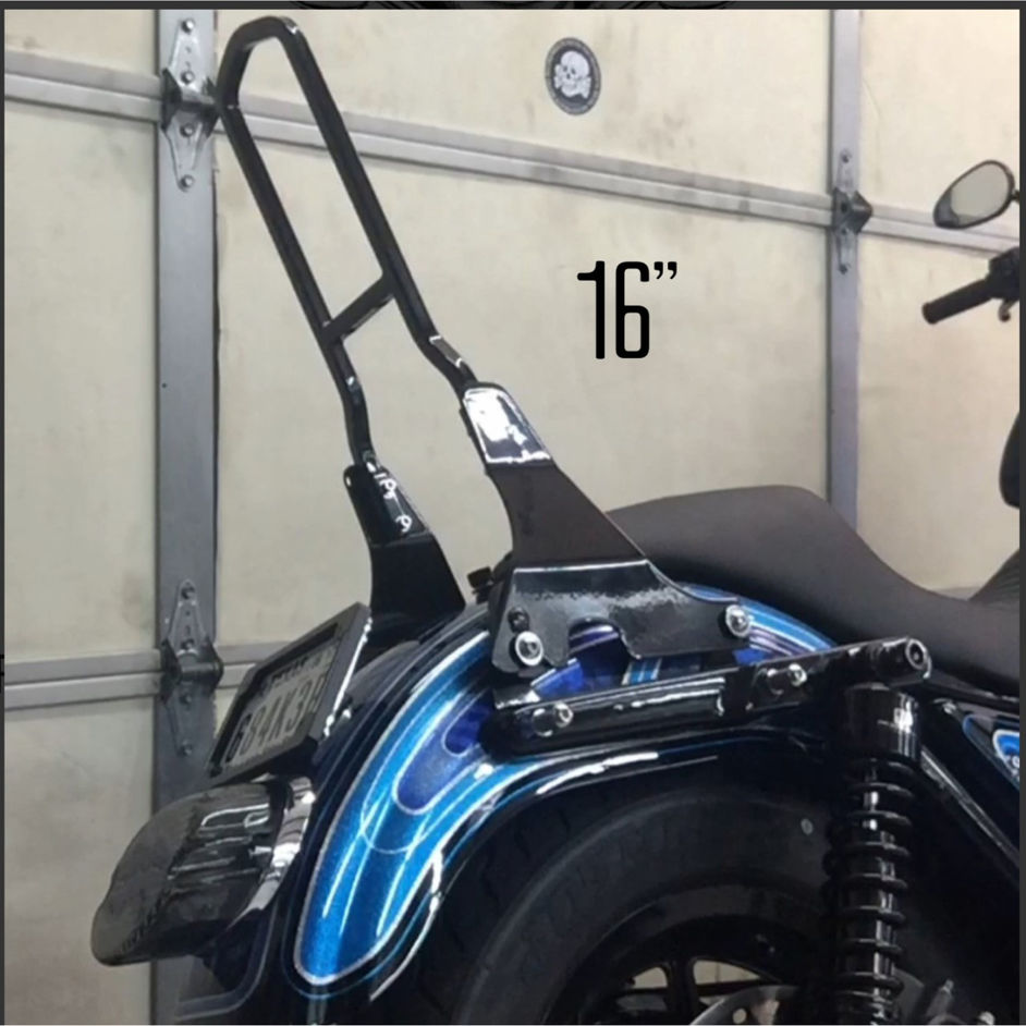 Quick detach sissy bar kit for FXR'S. THESE FIT ALL FXR'S INCLUDING MODELS WITH SADDLEBAGS SUCH AS FXRP, FXRT, FXRD. FITS OLD AND NEW STYLE FENDER STRUTS. SOME FXRT MODELS OR FXR'S RUNNING CLAM SHELL STYLE BAGS MAY REQUIRE SPACING THE BAGS OUT AT THE TOP APPROXIMATELY 3/8". WE WILL SUPPLY RUBBER SPACER/ISOLATORS WHEN YOU SELECT "YES" ON THE "FXRT STYLE BAGS" OPTION. THESE RUBBER SPACERS/ISOLATORS ARE NOT NEEDED WITH THE FXRP BAGS. Available in Chrome or Gloss black powdercoat. Chrome kits have chrome sissy bar (except 13" sissy bar which will be black since we make these and chrome costs have gotten so expensive, 11" and 16" will still have chrome sissy bars since those are outsourced), chrome quick detach side plates and gloss black powdercoated mouting plates (part that is mounted between fender and strut). Gloss black powdercoated kits have black sissy bar, black quick detach plates, and black mounting plates. Choice of sissy bar height. 11", 13", and 16". Measures from very top to bottom. Docking Hardware kit included. Pad options. No pad, short pad (recommened for 11" bar, 13", and will work on 16" also), and long pad (recommended for 16" but will work on 13" also). All pads are smooth not pillow style like in some pics which were used for height reference only. ALL PARTS CAN BE PURCHASED SEPARATELY ALSO. WE DO NOT RECOMMEND RUNNING A TOUR PAK THAT MOUNTS ON THE BACK ON THE LUGGAGE RACK WITH OUR QUICK DETACH SYSTEM. OUR SYSTEM WOULD PUT THE TOUR PACK UP HIGHER AND WITH THE WEIGHT OF THE TOUR PAK AND HOW FAR IT WOULD HANG OFF THE BACK, IT PUTS ALOT OF STRESS ON THE MOUNTS AND CAN CAUSE THEM TO BEND OR BREAK DUE TO THE CONSTANT PRYING. THERE ARE COMPANIES THAT MAKE A TOUR PAK MOUNT THAT PUTS THE TOUR PAK RIGHT OVER THE TOP OF OUR MOUNTS VERSUS OFF THE BACK AND THIS WILL KEEP THE TOUR PAK FROM BENDING THE STANDOFFS.
